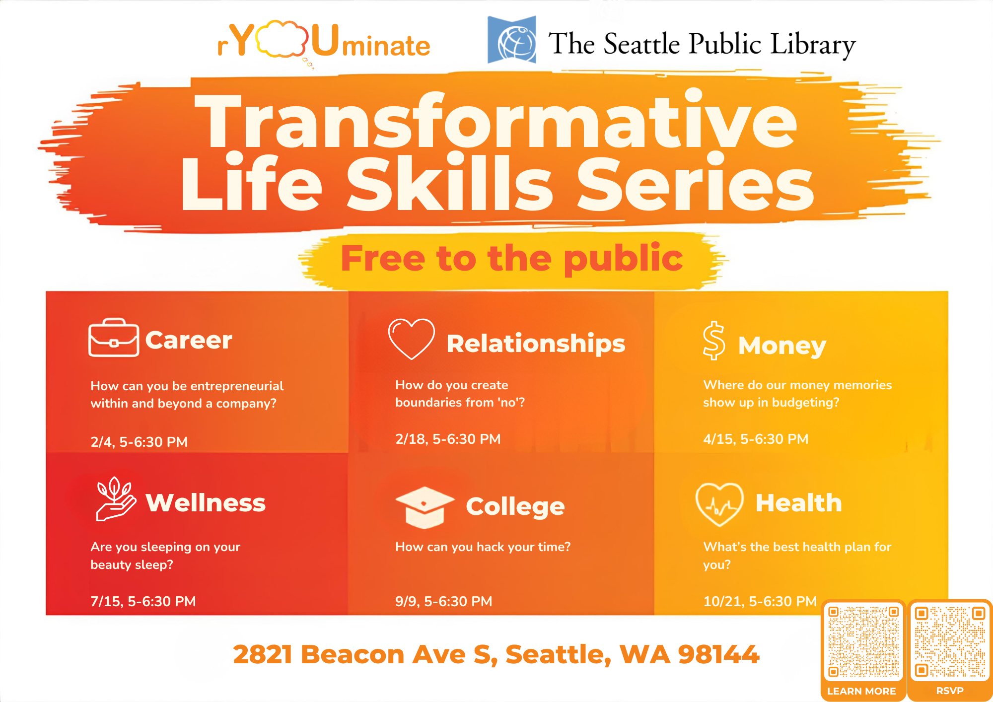 We're hosting 6 sessions, from health to wealth and everything in between, in partnership with Seattle Public Library. We're so excited to host a series about life skills for 18 to 30-year-olds in our community. If you or anyone you know would be interested, please share this flyer or read more about the events here.