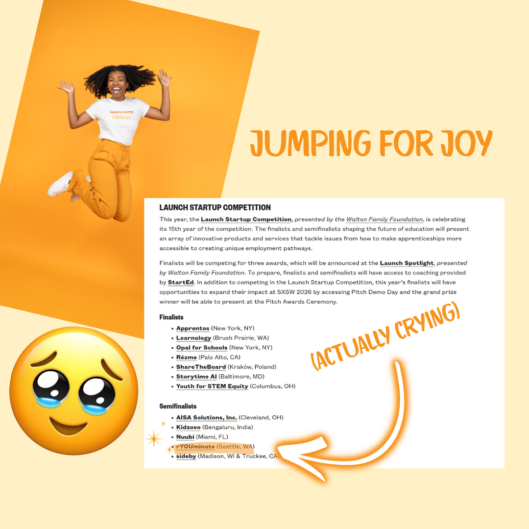 We're so thrilled that we're one of 12 finalists in the world for South by Southwest's education startup competition: EDU Launch. To have rYOUminate's impact highlighted on such a national and international scale is incredibly validating to the work we're doing and who we're doing this for.